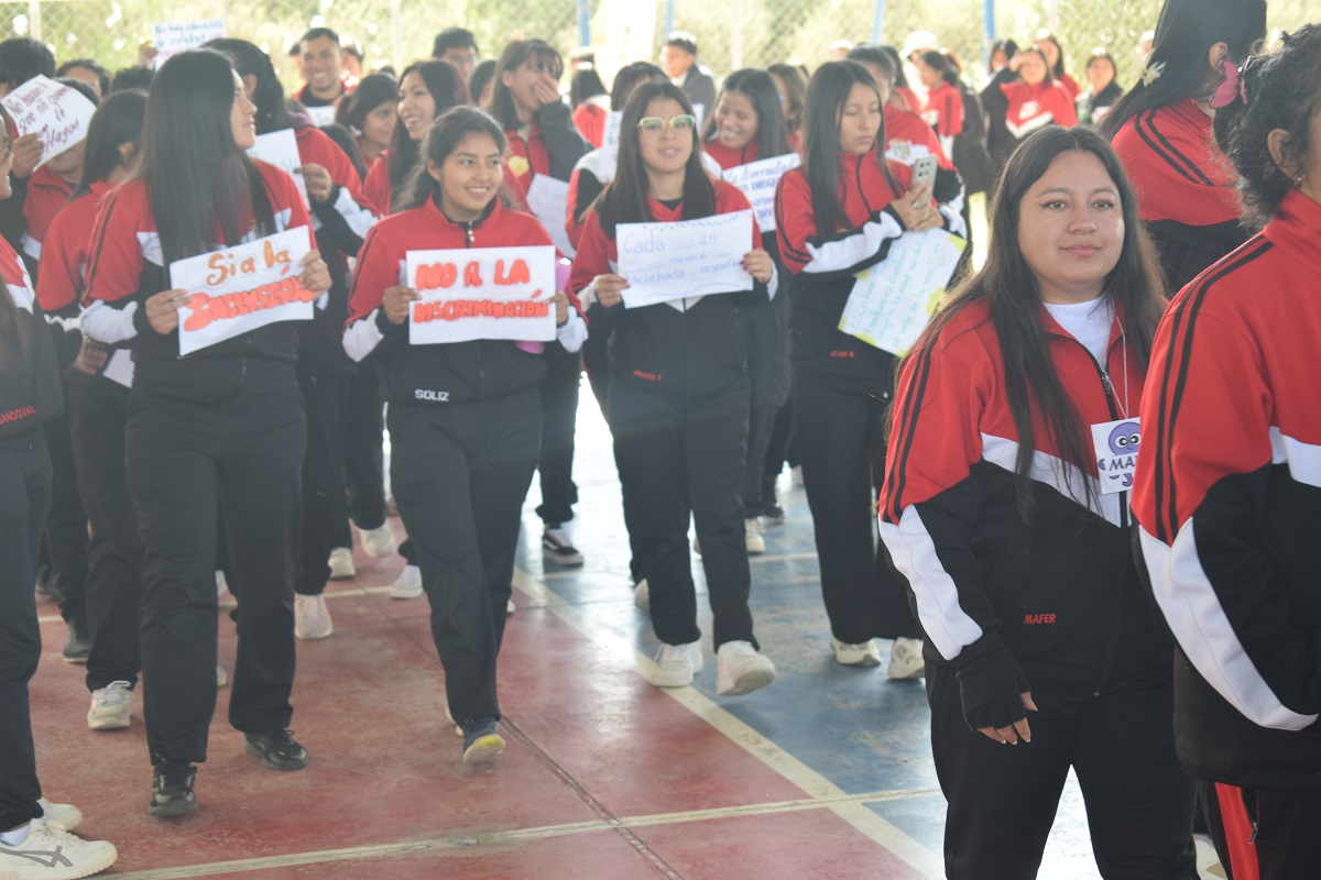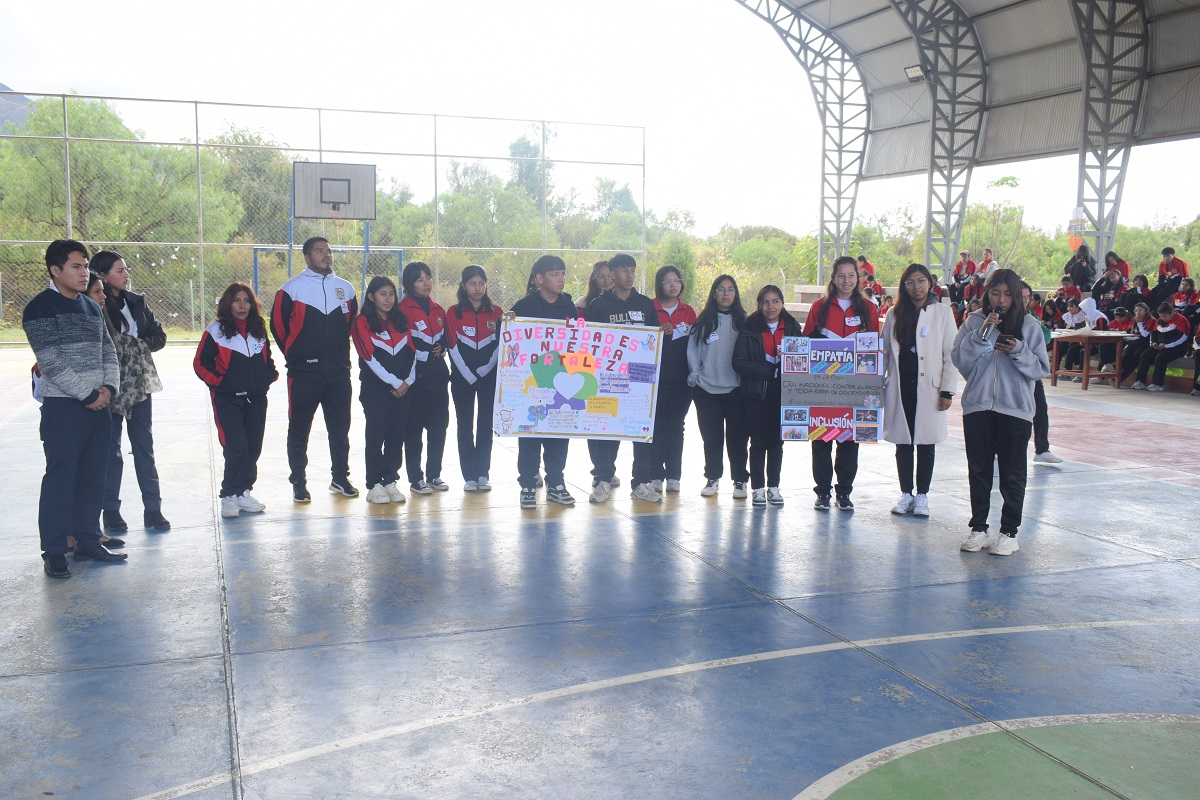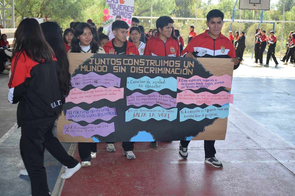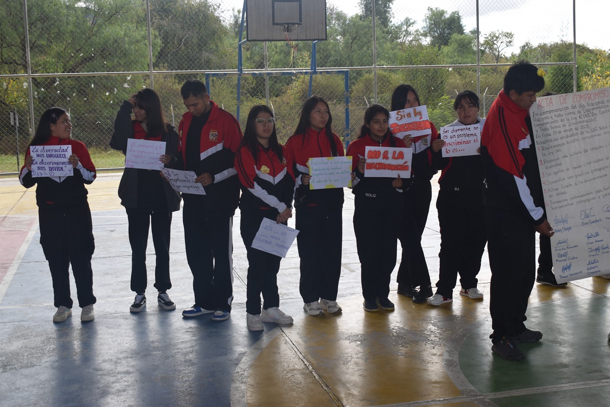 Los estudiantes con las pancartas alusivas a la fecha.